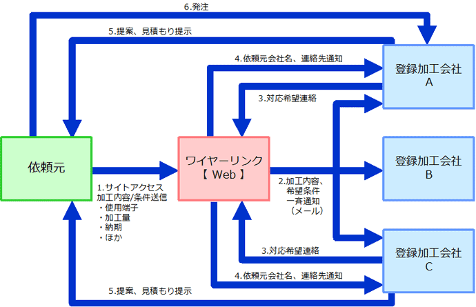 ワイヤーハーネス加工、ケーブル加工会社を探しているご依頼者から、加工内容と納期等の情報を貴社(登録加工会社)に伝えます。